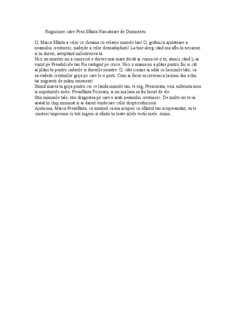 Catre prea sfanta nascatoare de dumnezeu. A) catre prea sfinta nascatoare de dumnezeu. Rugaciunea ultimilor stareti de la minastirea optina. 21.05.2012 · rugaciune catre nascatoarea de dumnezeu. Ceea ce esti mai cinstita decat heruvimii si mai marita fara de asemanare decat serafimii, care fara stricaciune pe dumnezeu cuvantul ai nascut, pe tine, cea cu adevarat nascatoare de dumnezeu, te marim. Catre prea sfanta nascatoare de … Rugăciune către preasfânta născătoare de dumnezeu. O, preasfântă fecioară, floarea firii … Catre prea sfanta nascatoare de dumnezeu.. Rugaciunea ultimilor stareti de la minastirea optina.